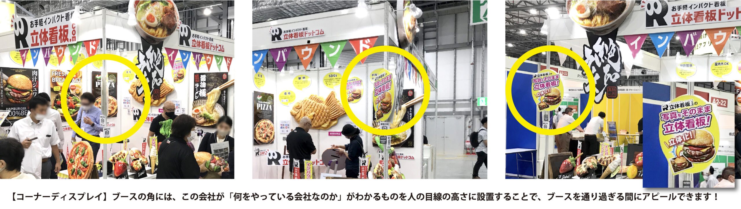 アピールしたいものをコーナーに置くことで、通路を歩く人の視線をキャッチし、そのまま自然とブース内へ誘導できます♪