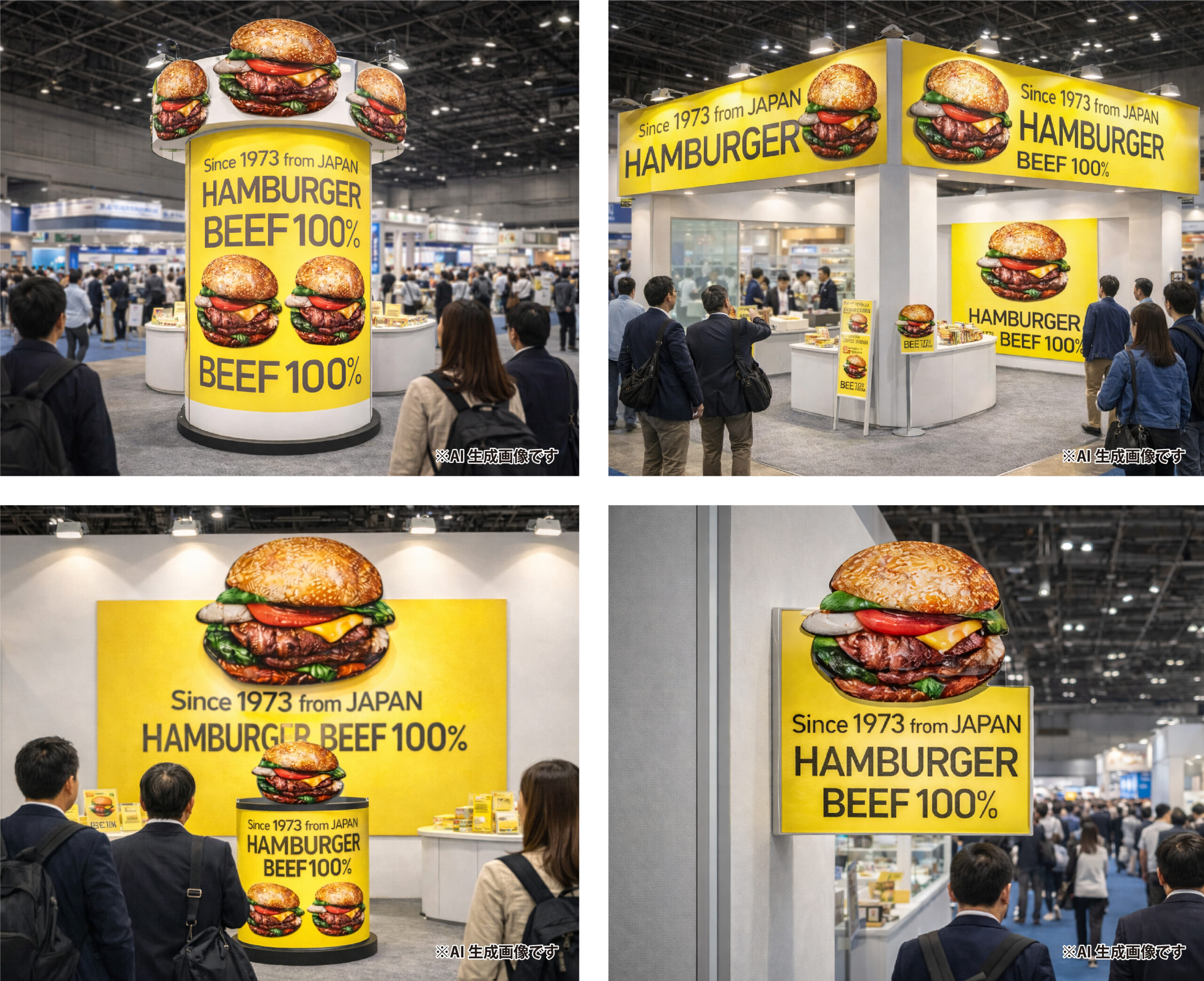 ブース奥の壁中央に大きな立体看板を配置し、背後から接近する人の視線をキャッチ。人の流れに合わせて注意を引けます👁️